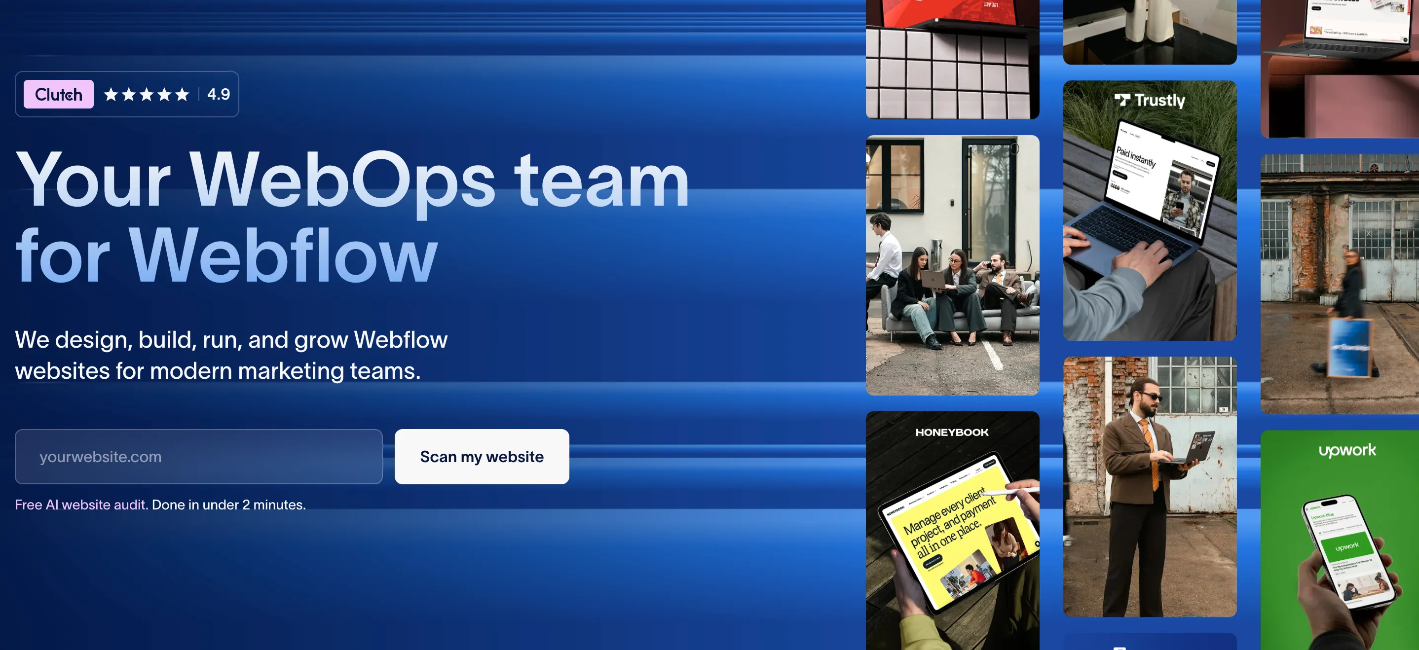 - Webflow services: Branding, design, development, SEO