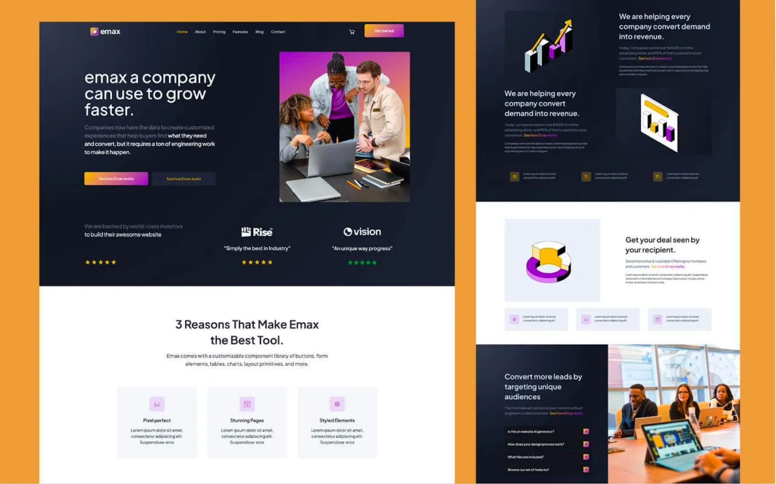 Description: Apart from startups, Emax is ideal for ecommerce, freelance portfolios, web agencies, and more. It’s an all-around template.