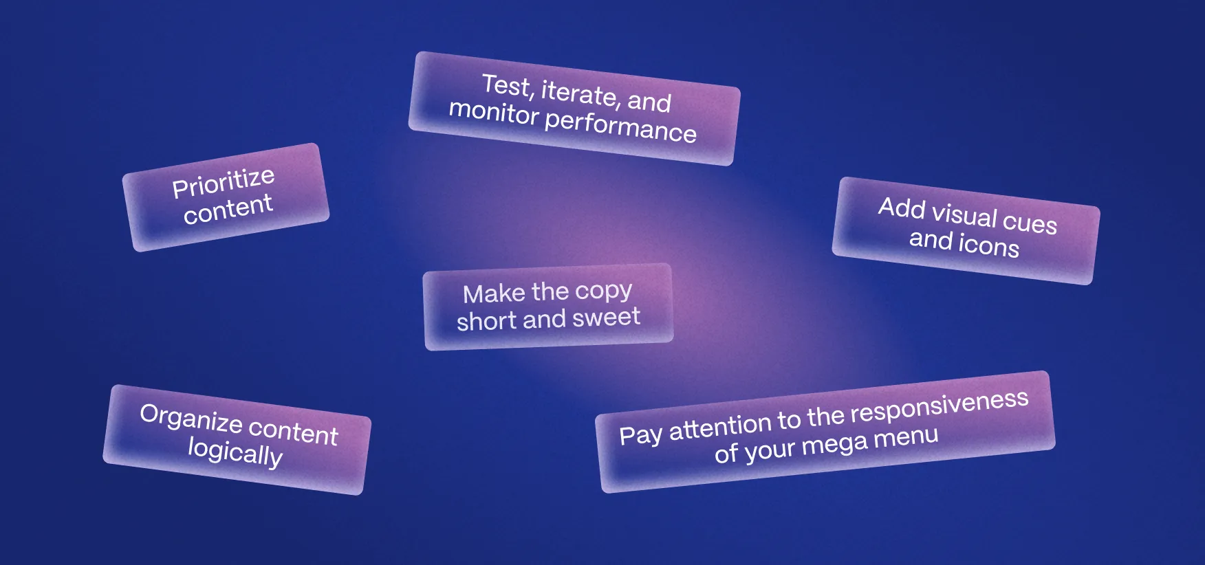 - Test, iterate, and monitor performance — Publishing your mega menu is just the first step. Once it’s live, it’s time to test it and make adjustments if needed. Sometimes, you’ll have to add new content to the site, meaning you should also add it to the mega menu.