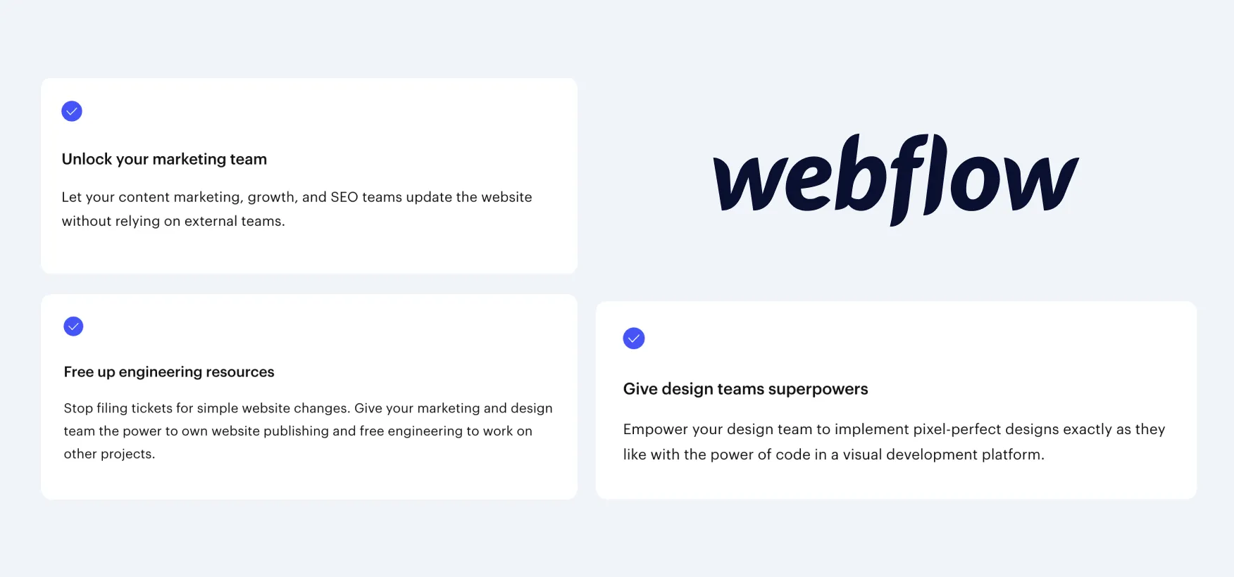 Webflow caters to the needs of marketing, design, and development teams. It gives them much better control over the website and its content without making them too interdependent.