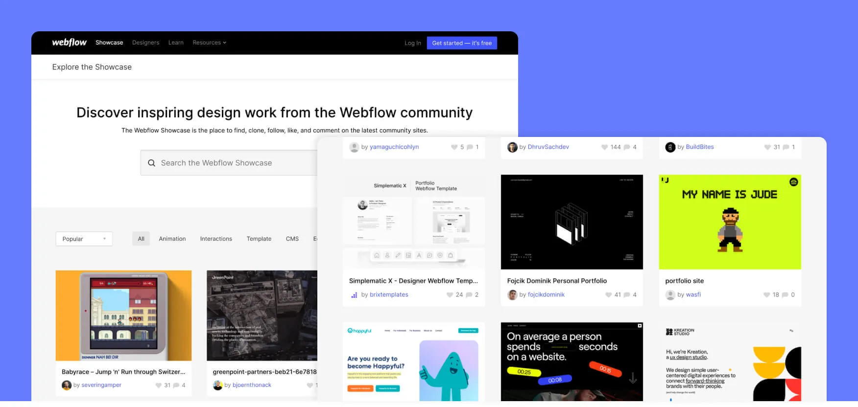 Webflow Showcase is an official section on Webflow’s website, where you can discover work from other Webflow enthusiasts and professionals who are part of the highly-engaging community. You can find animations, interactions, templates, and other works related to CMS, e-commerce, portfolio sites, and more. Some of them are true works of art.