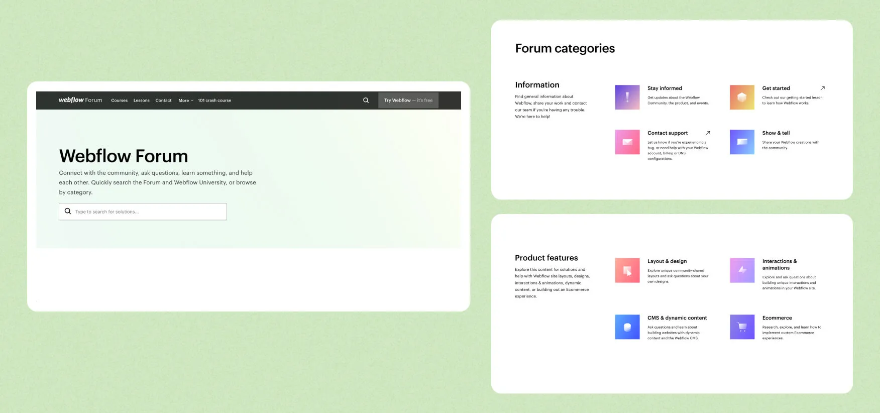 Webflow Forum is an excellent place to share your work, ask questions, and get help from fellow Webflow users. It’s suitable for beginners and advanced users alike. Find advice on design, custom code, Webflow SEO practices, and more.