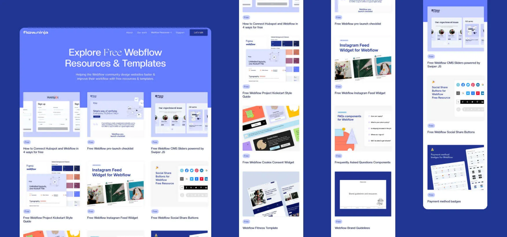 In addition to providing Webflow services, Flow Ninja features a range of helpful Webflow resources. We offer both free resources and paid Webflow templates that can help you kickstart your Webflow journey and assist you with building your site faster. Moreover, we’re committed to educating Webflow users with our free and paid Webflow resources. Finally, we have a Webflow blog dedicated to everything related to the popular platform.