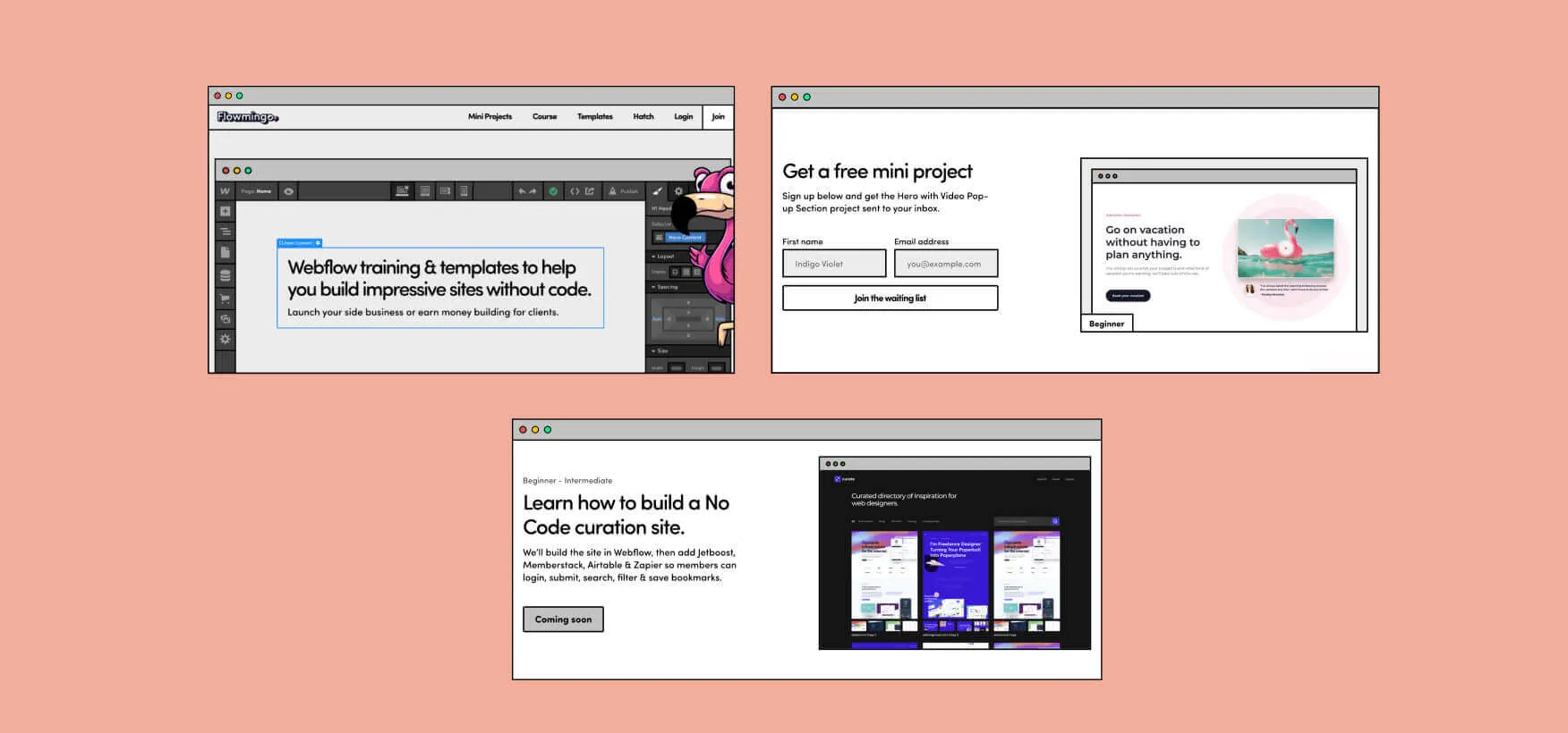 Flowmingo is marketed as a Webflow training platform that also features templates. What makes it stand out from the crowd is the Mini Projects section which features short courses that take less than an hour to complete and teach you to do exciting things with Webflow. The templates section is still relatively small, as the main focus is on the courses.