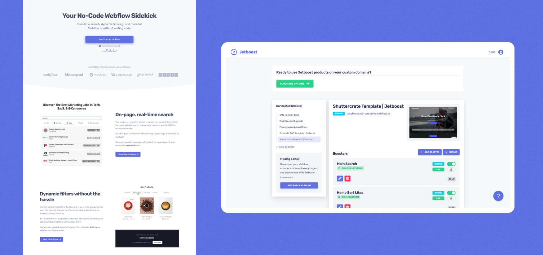 Marketed as a Webflow sidekick, Jetboost is an extension for Webflow that adds advanced functionality. Some of the 'boosters' it offers include real-time list search, dynamic filtering and sorting, advanced pagination, and a range of CMS features, such as item favoring, auto achieving, and CMS lightbox.
