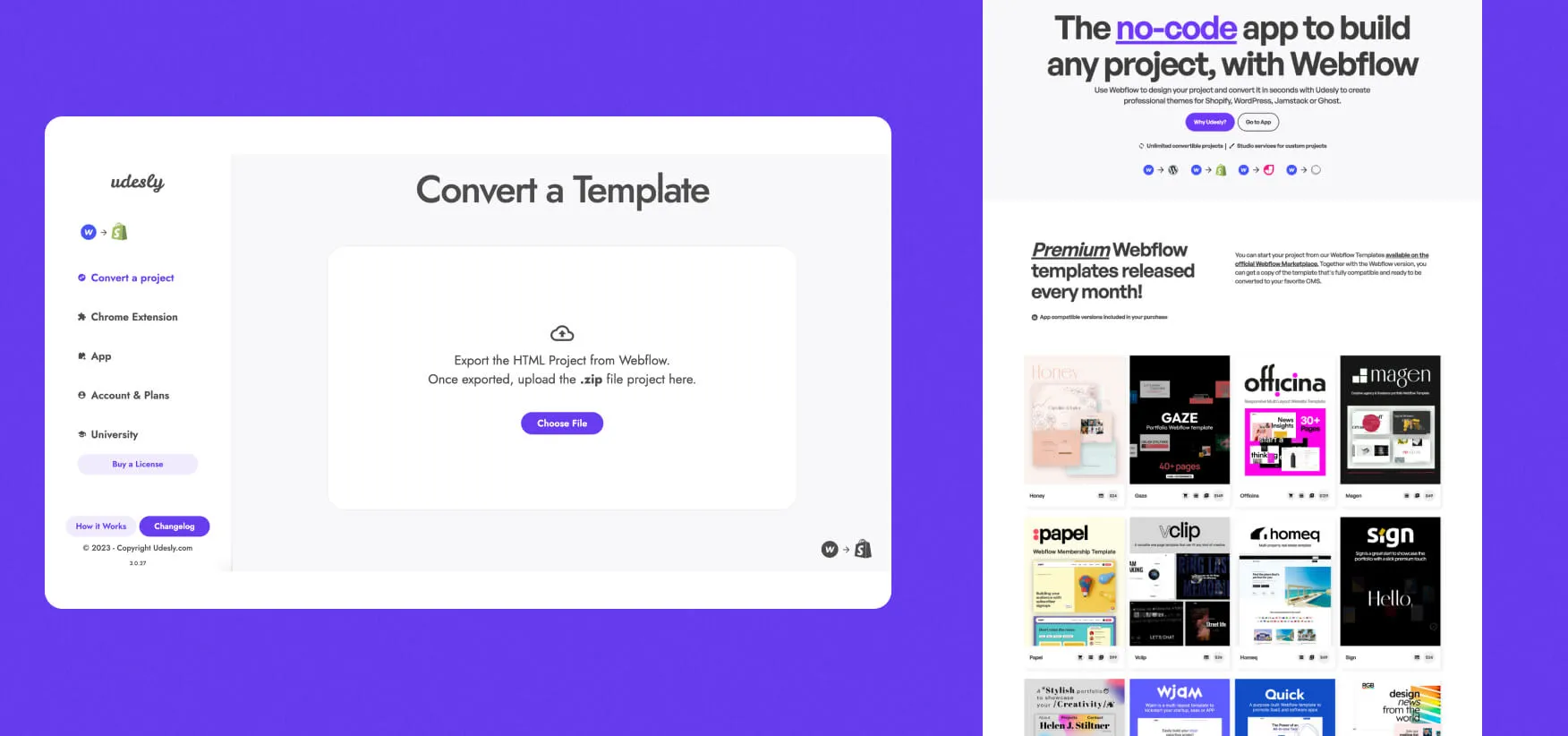 Udesly converts Webflow projects into templates for WordPress, Shopify, Jamstack, and Ghost using a Chrome extension. You design and build in Webflow, then export and process the project through Udesly. A free plan allows unlimited conversions, with paid tiers removing Udesly branding.
