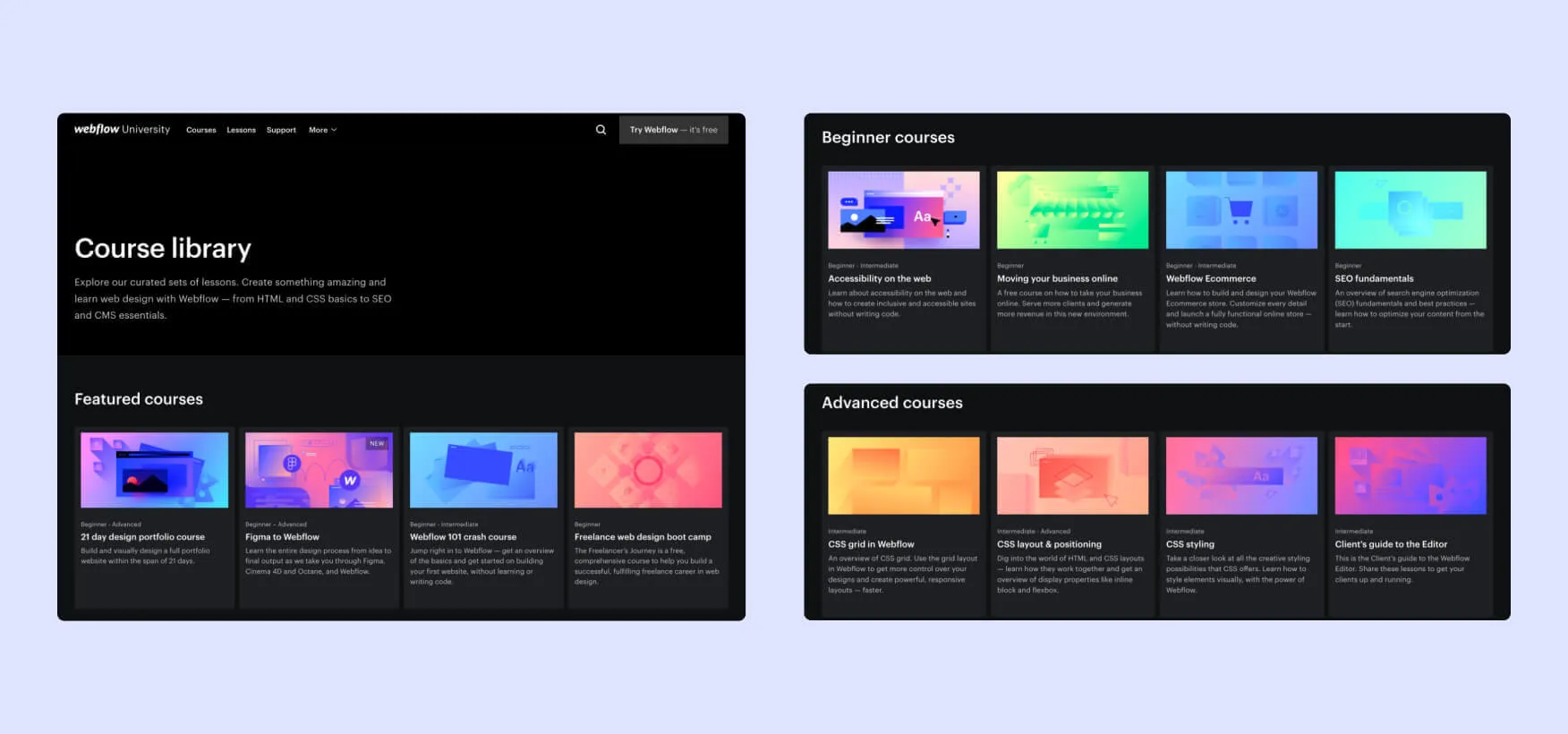 Like it or not, the best resources for Webflow are made by no other than Webflow. It features a section on the site called Webflow University, which offers free courses and lessons for anyone interested in learning the basics and mastering the popular Website builder. There are hundreds of tutorial videos covering the majority of tools and features available on Webflow.