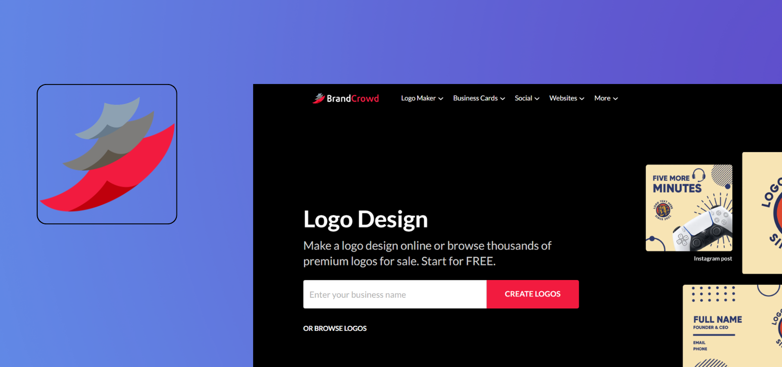 BrandCrowd offers a free plan where downloading a logo gives you access to a free website builder and afree digital business card maker. The Starter plan starts at $3 per month and can go up to Premium starting at $5 per month.