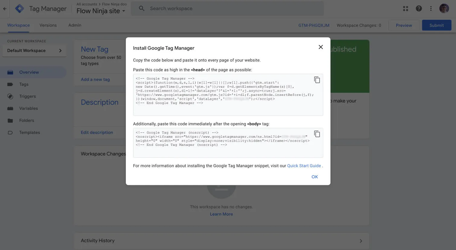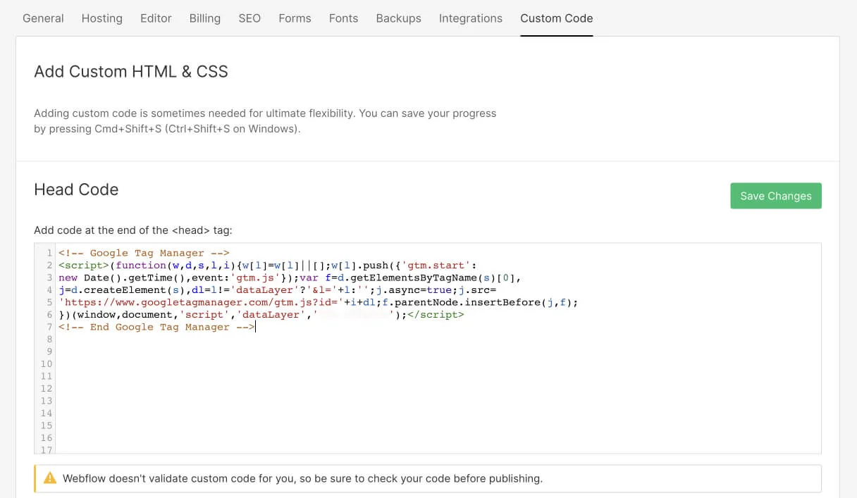 Once you open an account, you’ll have to integrate your Google Tag Manager in Webflow. You’ll see two code snippets, so here’s how to use them to complete this process.