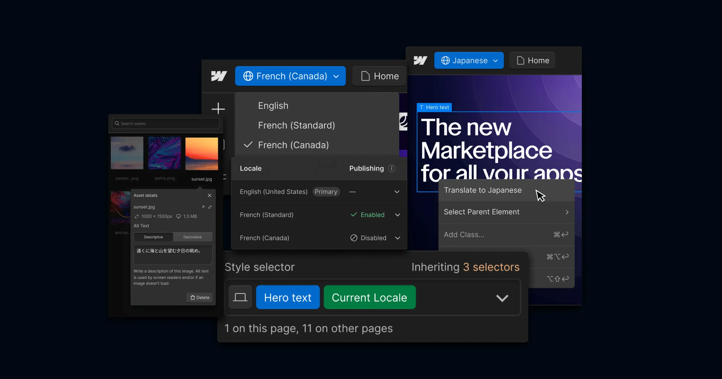 - Design and content customization — In the Webflow Designer, users can design and build their site with localized content. They can customize static pages, CMS content, images, alt text, and styles for each locale.