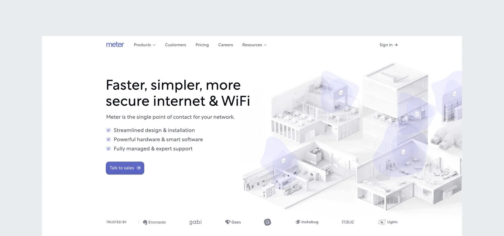 Meter is marketed as a company providing a single point of contact for a network, offering the services of setting up and maintaining one such network and charging by the square foot of coverage.
