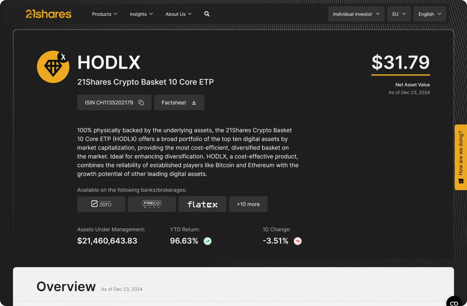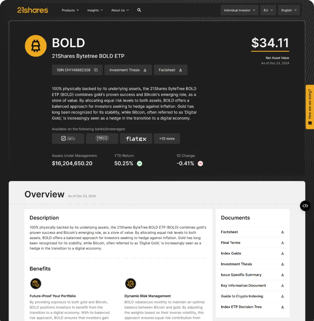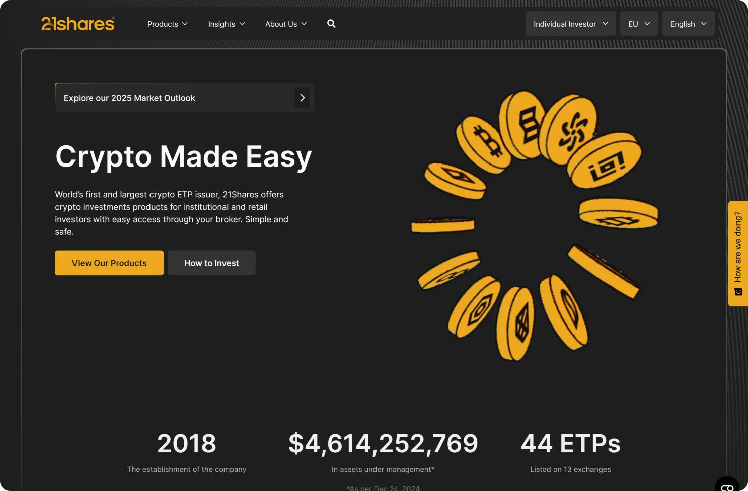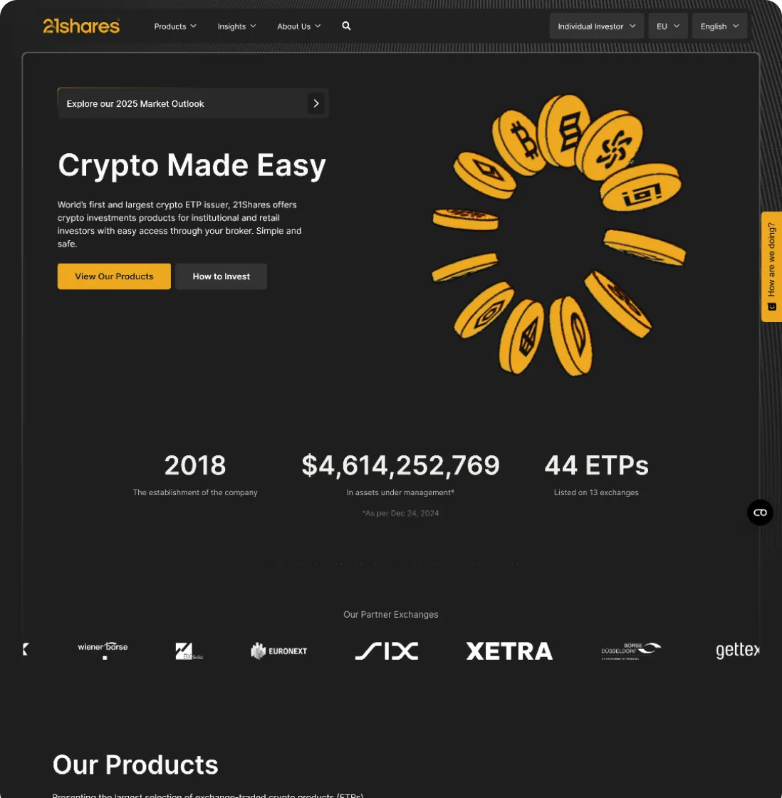 Established in 2018, the company introduced the world's first physically backed crypto ETP and, in partnership with Ark Invest, launched the first Spot Bitcoin ETF in the United States in 2024.
